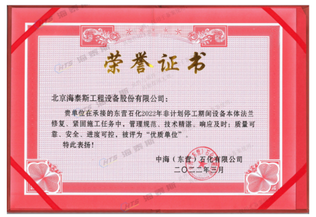 海泰斯獲評“優(yōu)質(zhì)單位”!負責的催化裝置、常減壓裝置泄漏法蘭的在線修復和定力矩緊固施工任務(wù),實現(xiàn)了“零泄漏”的目標。